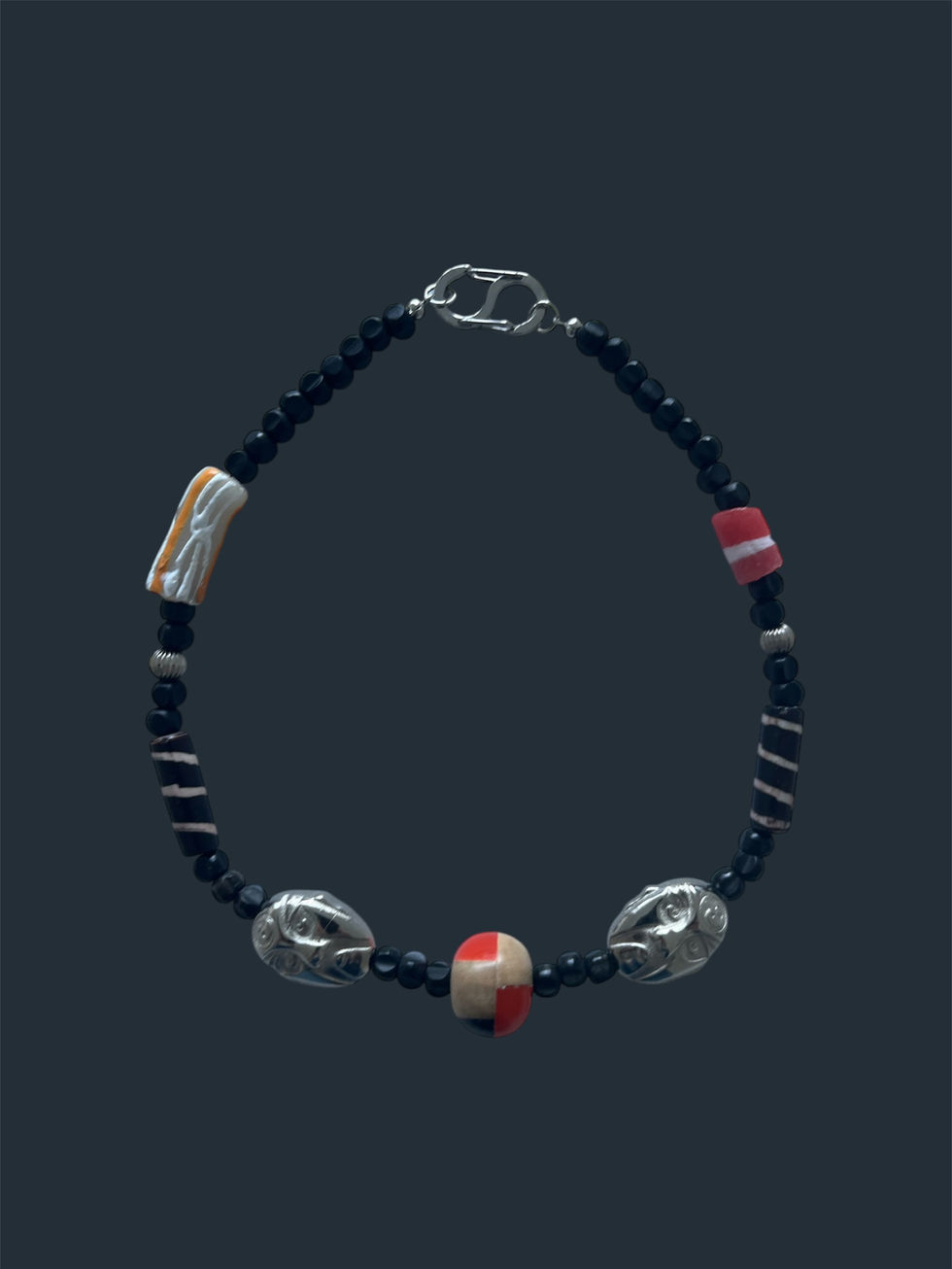 Silver tone carved faces with mismatched african beads. Length is appx 16".